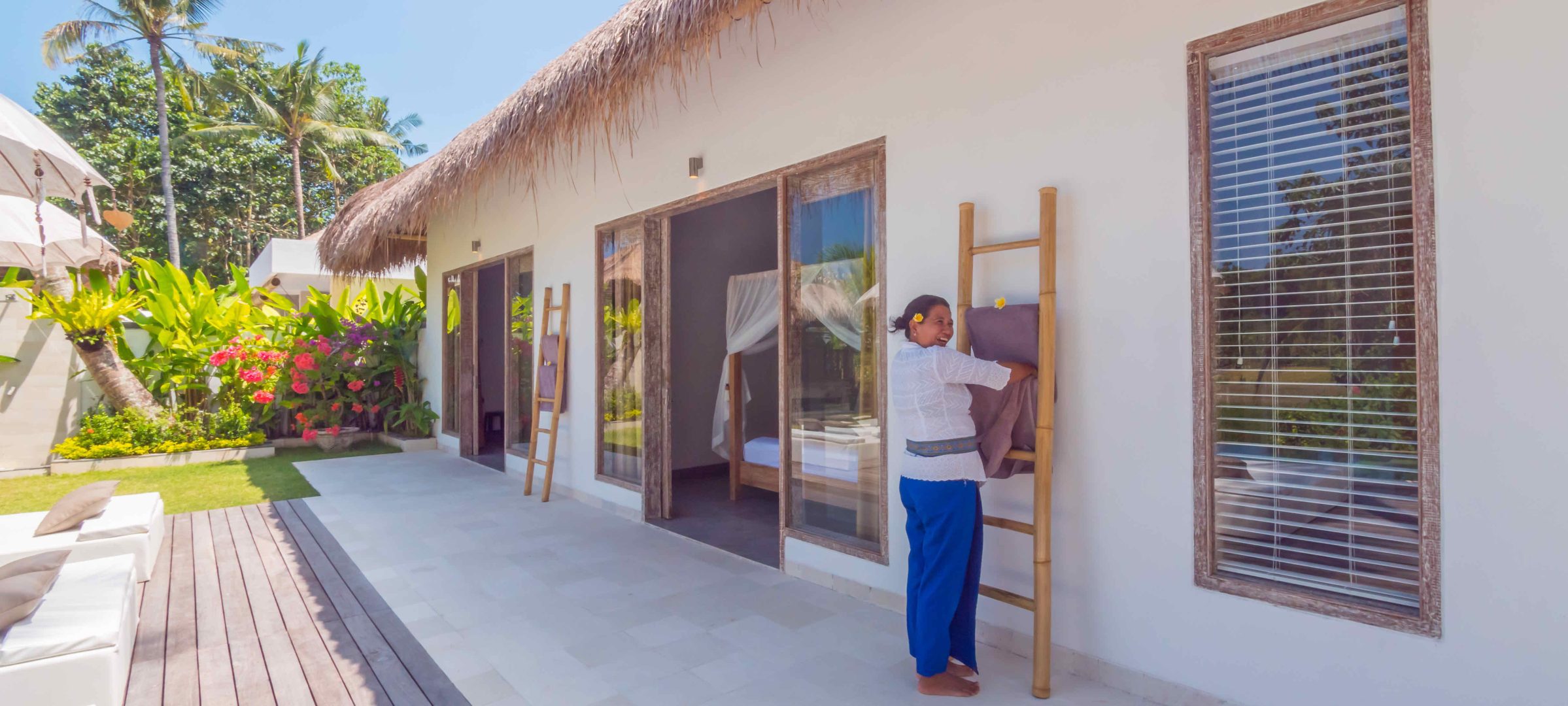 During your stay at Villa Hidden Jewel, you will be cared for full-time by dedicated staff. The friendly ladies, Ayu and Wayan, handle the villaβs cleaning every day, do the shopping, and can prepare meals for you. This is all included in the rental price. Our gardener, Ketut, ensures that the garden is immaculate and the pool is cleaned daily. While Bali is generally safe, there is security present to ensure peace of mind during the nights.